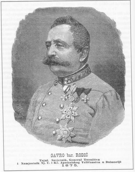 „VLAVDAJVĆI FRANJO JOSPI I. CESAR AVSTRIJSKI BVDVČ NAMJESTNIKOM BARVN GAVRIL RODIĆ KOTARSKIM POGLAVAROM VITEZ IVAN Dr LVXARDO OVA CESTA PROZVANA BARVN RODIĆ NACRTANA BI PO SATNIKV VIT. G BLONDEINV SVDJELOVANJEM PVKA SAGRADJENA OD SATNIJA18 OBKOPNKIKA 8 I 9 MJERNIKA II PVKOVNIJE OTVORENA G. MDCCCLXXVIII.“