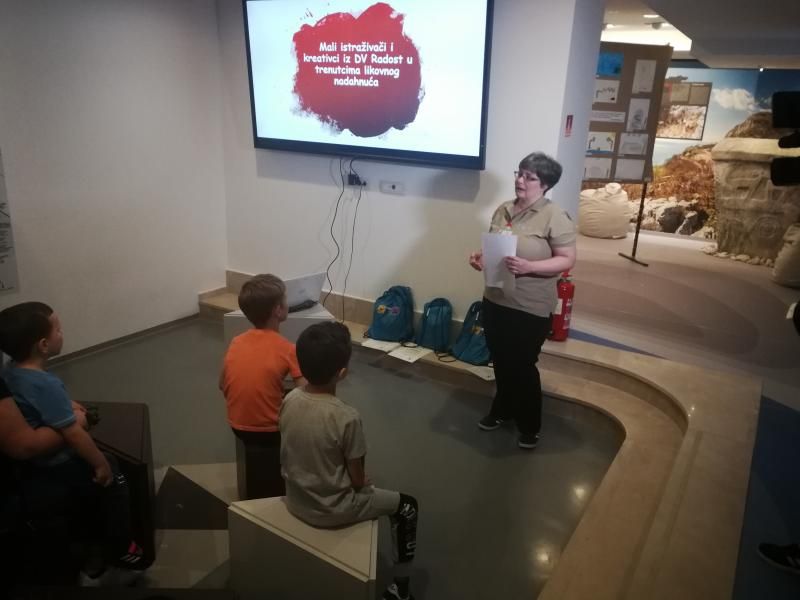 Potom je prikazana kratka projekcija fotografija i kratkih videa koje je odgajateljica Tanja Kučeković snimila prilikom izrade grupnog rada u DV Radost, te se prisutnimaobratila i Ivana Gabrić stručna suradnica biolog-ekolog uz zahvalu učiteljicama i odgajateljicama kao i roditeljima na podršci u realizaciji projekta sa pozivom na daljinu suradnju s ciljem poticanja djece na istraživanje i razvijanje pozitivnog vrijednosnog odnosa prema svim živim bićima i prirodi kao cjelini. Odgajateljica Tanja Kučeković kratko je opisala kako je tekao proces izrade grupnog rada, što su zorno pokazale prikazane fotografije i snimke sa sretnim izrazima na dječjim licima.